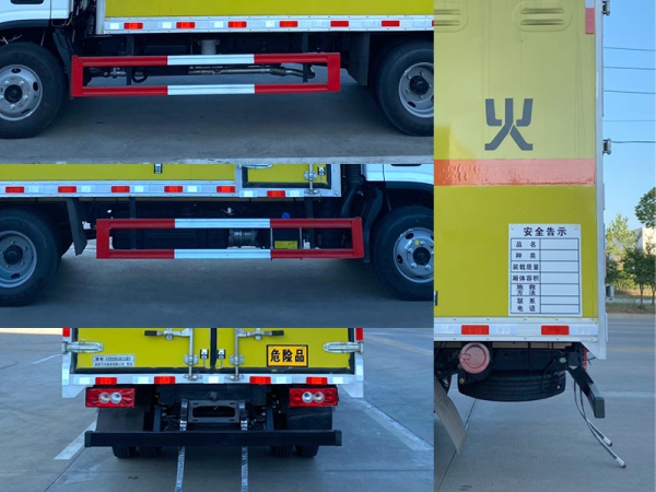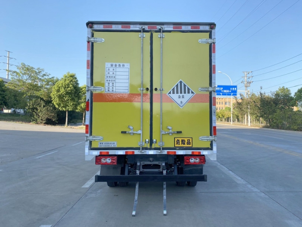 嚴(yán)格按照公告尺寸制作。外板采用優(yōu)質(zhì)冷軋鋼板帶百葉窗,內(nèi)飾為導(dǎo)電性能良好的鋁平板有透氣孔,矩形骨架結(jié)構(gòu)內(nèi)部填充防潮阻燃擠朔板,復(fù)合加鉚合工藝。廂體四周鋁合金包邊及包角,車廂底板鋪設(shè)防靜電膠皮,廂體前臉50公分高鋪設(shè)防靜電膠皮。后部設(shè)置對(duì)開門,可選裝側(cè)門位置,廂體內(nèi)部?jī)蓚?cè)安裝捆綁貨物的臥環(huán)。廂體內(nèi)部安裝氣體感應(yīng)器及防盜報(bào)警器。車廂一周粘貼橙色放光帶,箱體粘貼 菱形告示牌,安全告示牌,危險(xiǎn)品牌,箱體安裝示廓燈(前白后紅),拖地靜電帶。箱體可選裝瓦楞板工藝。