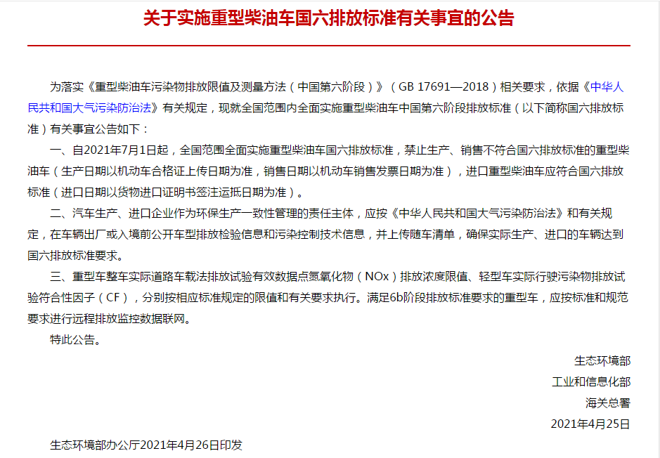 2021年4月26日,**生態(tài)環(huán)境部、工業(yè)和信息化部、海關(guān)總署印發(fā)《關(guān)于實(shí)施重型柴油車國六排放標(biāo)準(zhǔn)有關(guān)事宜的公告》(公告 2021年 第14號)。